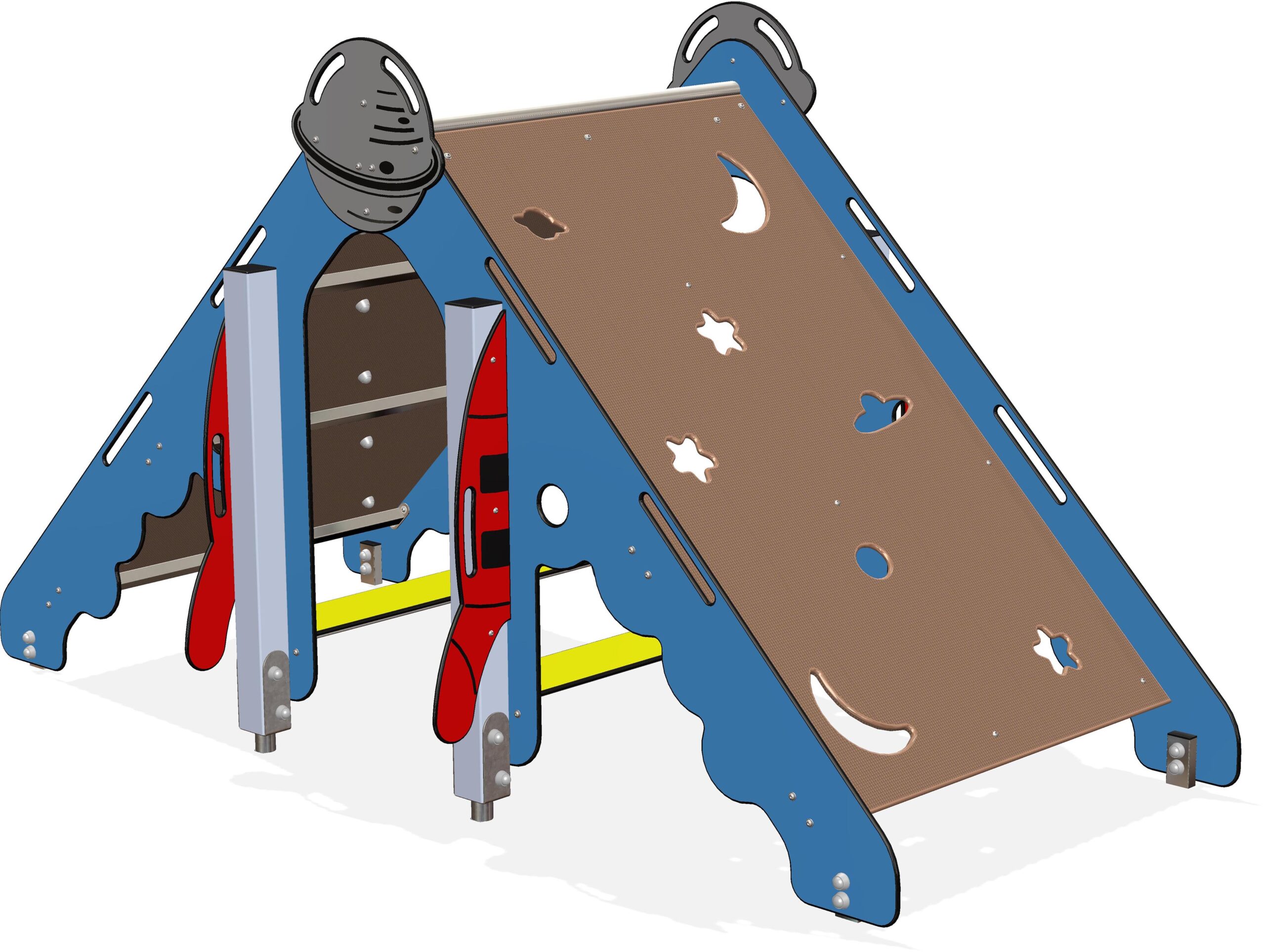 Les petits astronautes peuvent s’amuser à escalader une face avec des prises pour une ascension facile, tandis que l’autre côté propose un mur avec des découpes en forme de lune et d’étoiles pour des défis amusants. Deux fausses fusées et une sphère, qui ressemble à un casque d’astronaute, complètent le design futuriste de cette cabane.