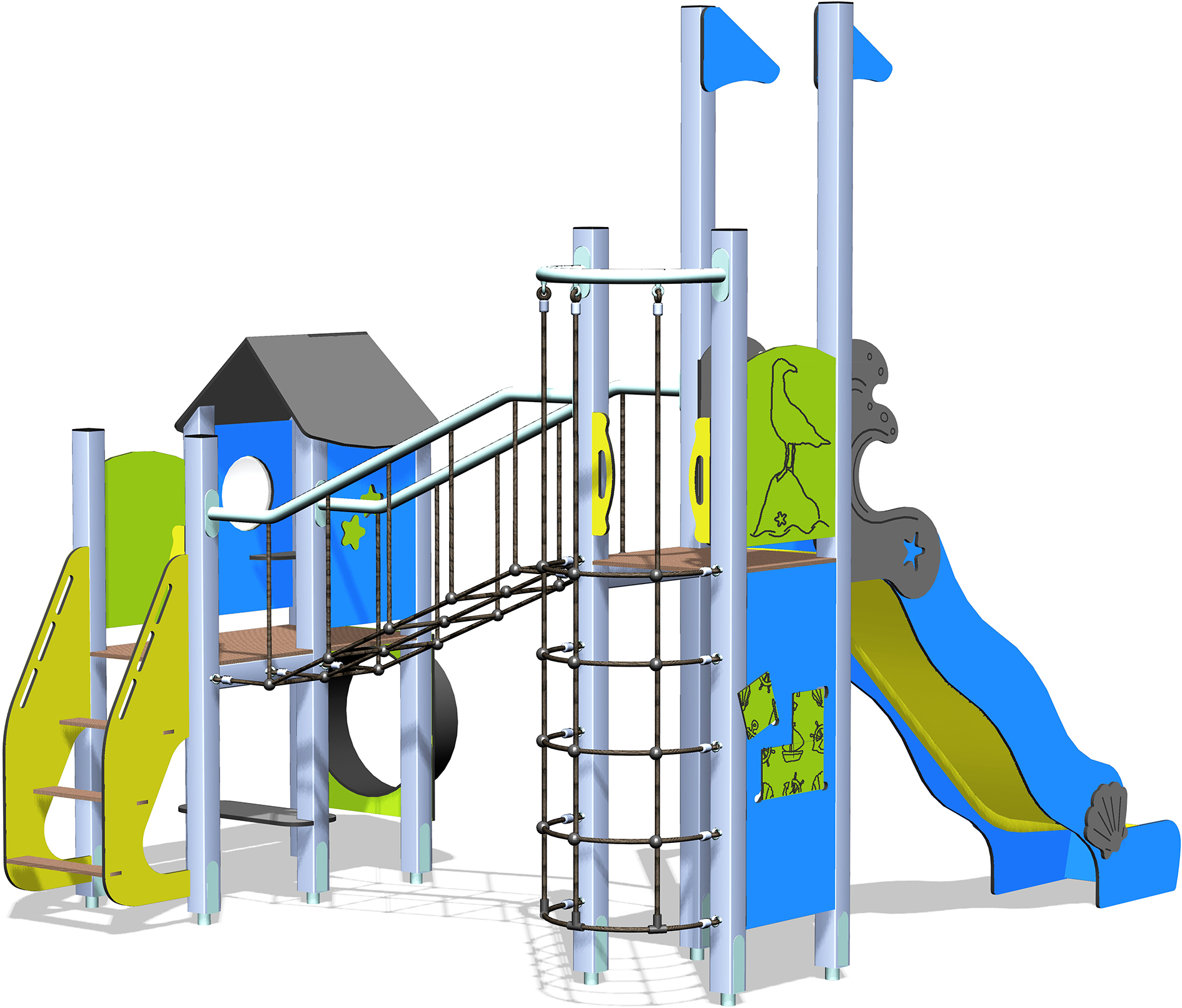 Enfin, pour un retour sur la terre ferme, le grand toboggan en forme de vague vous garantit une glissade rapide qui se termine en douceur, comme sur la plage ! N’oubliez pas le tunnel pour ramper et vous cacher sous le pont !