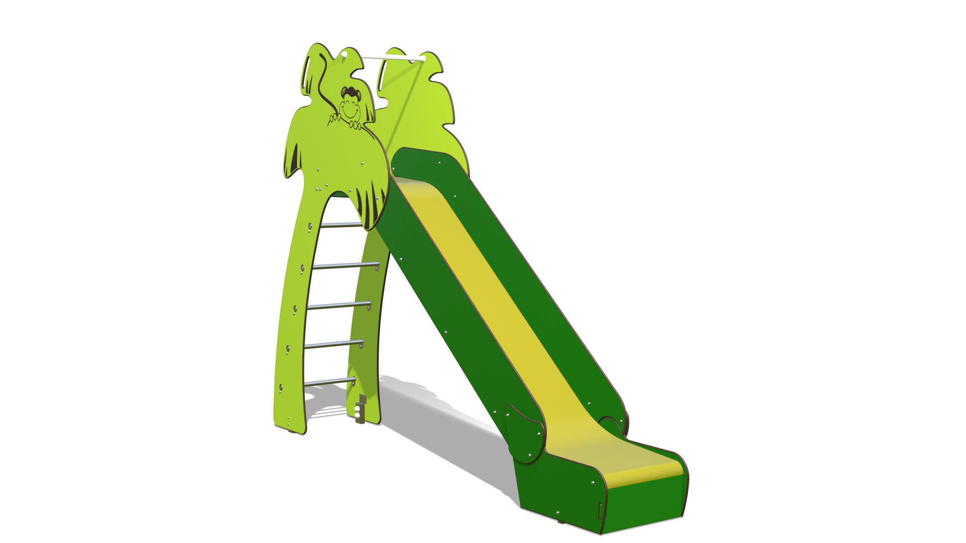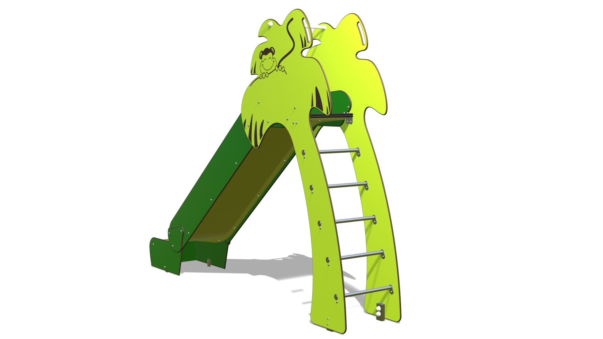 folle descente. Arrivé au sommet, tu te retrouveras sur une petite plateforme abritée par le feuillage stylisé, comme un nid douillet au cœur de la jungle. Une barre de maintien est là pour t’assurer avant le grand plongeon. Le toboggan lui-même est une pente large et invitante, dont la surface brillante t’attend pour une glissade rapide et joyeuse. Sa bande centrale contraste joliment avec les côtés, créant un effet de chemin sinueux au milieu de la végétation.