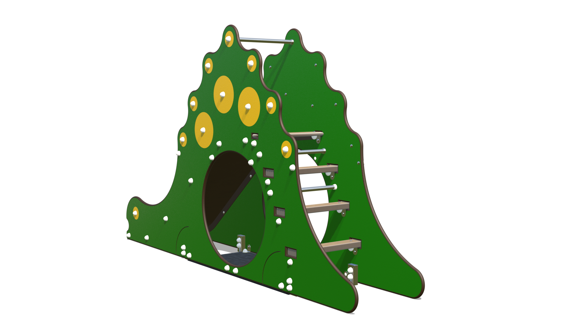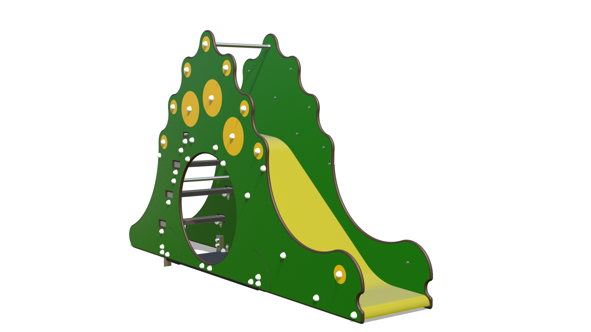 Le DINO n’est pas une simple structure de jeu, c’est un compagnon venu du Jurassique qui a décidé de se reposer dans la cour de récréation. Avec ses grandes écailles jaunes et son dos vert, il ne demande qu’à jouer. L’aventure se joue en trois actes :