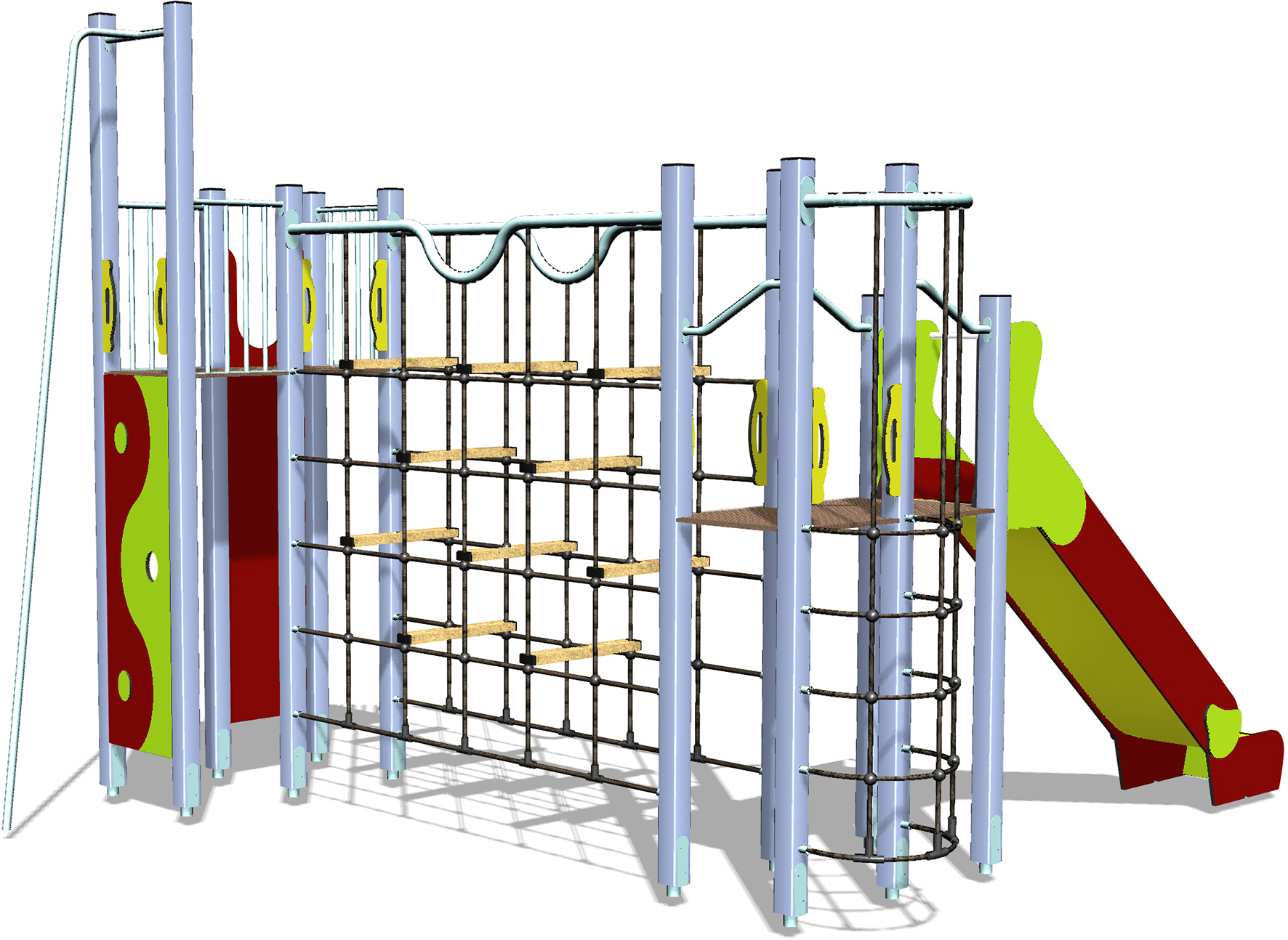 Découvrez cette structure de jeu étendue, un parcours linéaire conçu pour l’aventure et l’agilité, parfait pour les explorateurs qui aiment se déplacer en toute liberté. Cet ensemble dynamique combine des poteaux métalliques robustes avec des panneaux stylisés, créant une succession d’obstacles stimulants. Les jeunes aventuriers peuvent s’élancer sur un grand toboggan pour une descente pleine d’adrénaline, avant de se diriger vers une série de défis horizontaux et verticaux. Au programme : une grande section de filet avec des marches en bois intégrées, offrant une expérience d’escalade unique qui développe l’équilibre et la coordination, ainsi que des passages sur plateformes en hauteur. Le parcours se poursuit avec un mur d’escalade vertical, équipé de prises pour solliciter la force des bras et des jambes, et se termine par une échelle traditionnelle. Cette structure multifonctionnelle est idéale pour favoriser la motricité globale, la confiance en soi et le jeu créatif. Prêts à relever tous les défis ? Vos petits aventuriers n’attendront pas pour se lancer !