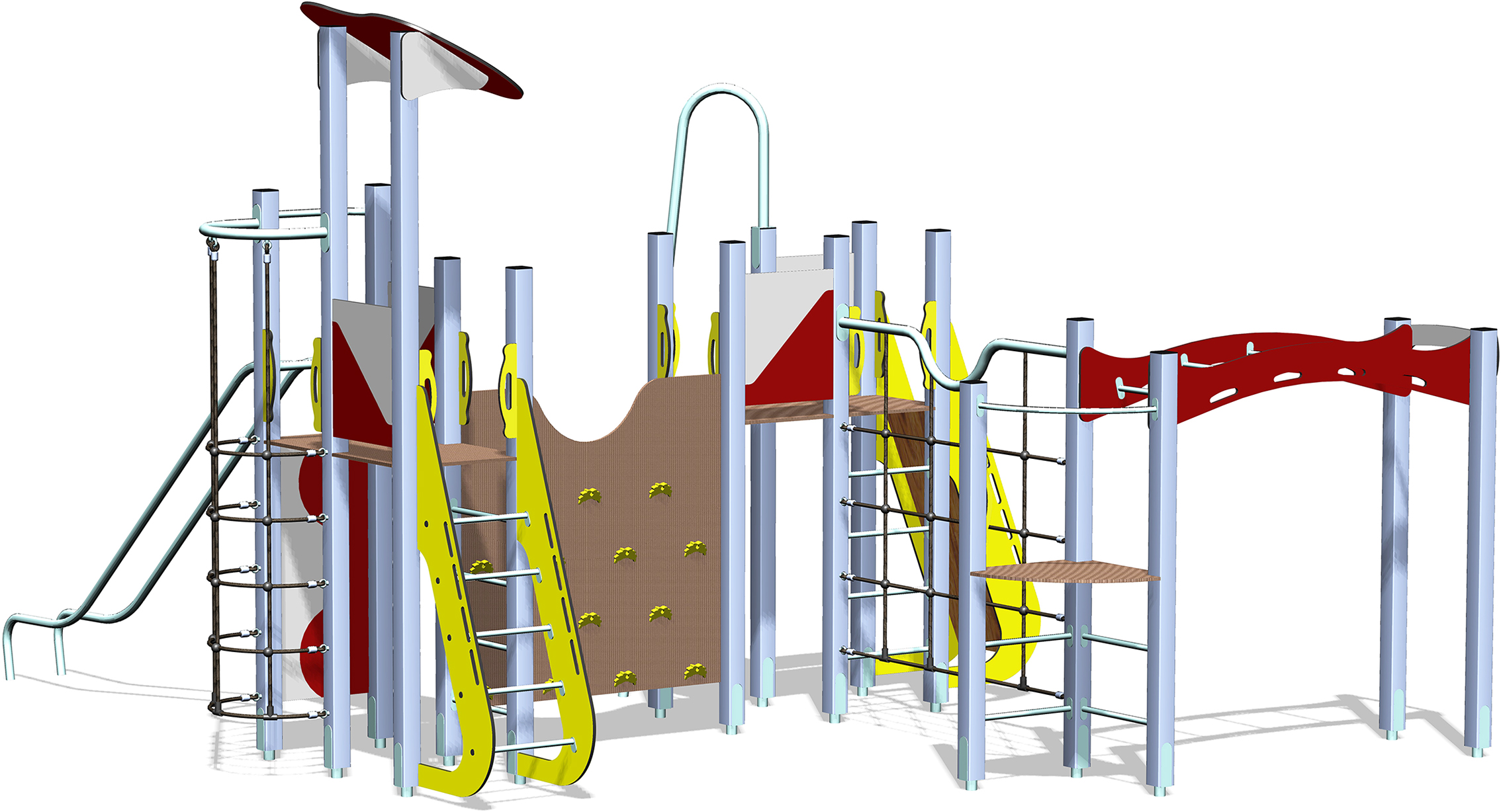 Découvrez cette aire de jeu modulaire expansive, un véritable parcours d’agilité conçu pour stimuler l’imagination et l’activité physique des enfants. Structurée par des poteaux métalliques robustes et intégrant des panneaux décoratifs aux formes dynamiques, cette structure propose une succession de défis pour une exploration sans fin. L’accès aux plateformes se fait par plusieurs moyens : une large échelle inclinée à marches, une échelle verticale pour les plus audacieux, un filet d’escalade exigeant ou un mur d’escalade vertical ondulé muni de prises. Une fois en hauteur, les enfants peuvent traverser les différentes sections en passant par des plateformes et un pont incurvé qui nécessite agilité et équilibre. L’ensemble est complété par deux toboggans de formes différentes pour des descentes rapides et amusantes, et une barre d’accès arquée pour les exercices de suspension. Cet équipement complet est idéal pour développer la motricité fine et globale, ainsi que la coordination. Que l’aventure commence, et que le meilleur explorateur gagne la course jusqu’au toboggan !