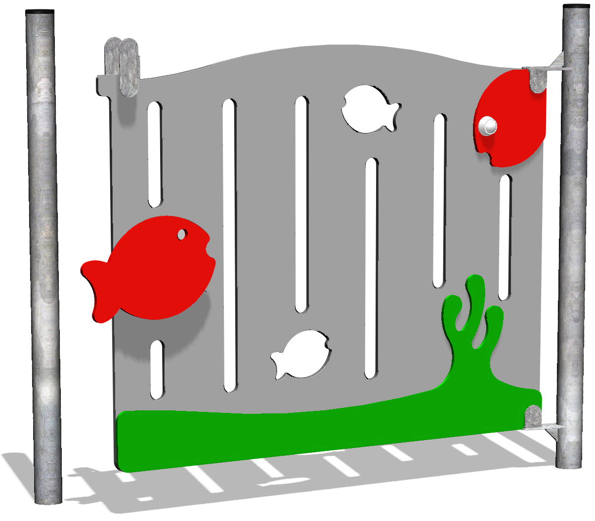 Préparez-vous à plonger ! Ce portillon thématique ouvre les portes d’une aire de jeu transformée en univers sous-marin fascinant. Le panneau évoque un fond d’océan, avec une base sculptée représentant les algues et le plancher marin, et des fentes verticales suggérant le mouvement de l’eau. Au centre, des silhouettes de poissons nagent joyeusement, certaines en relief, capturant l’imagination et invitant à la découverte. Monté solidement entre deux poteaux d’acier, il assure la sécurité tout en décorant l’espace avec fantaisie. Ce portillon n’est pas qu’une simple barrière ; c’est un sas d’exploration, marquant l’entrée vers un royaume aquatique où les jeux sont des trésors et les amis, des compagnons de plongée. Il promet une aventure fraîche et ludique dès le premier pas.