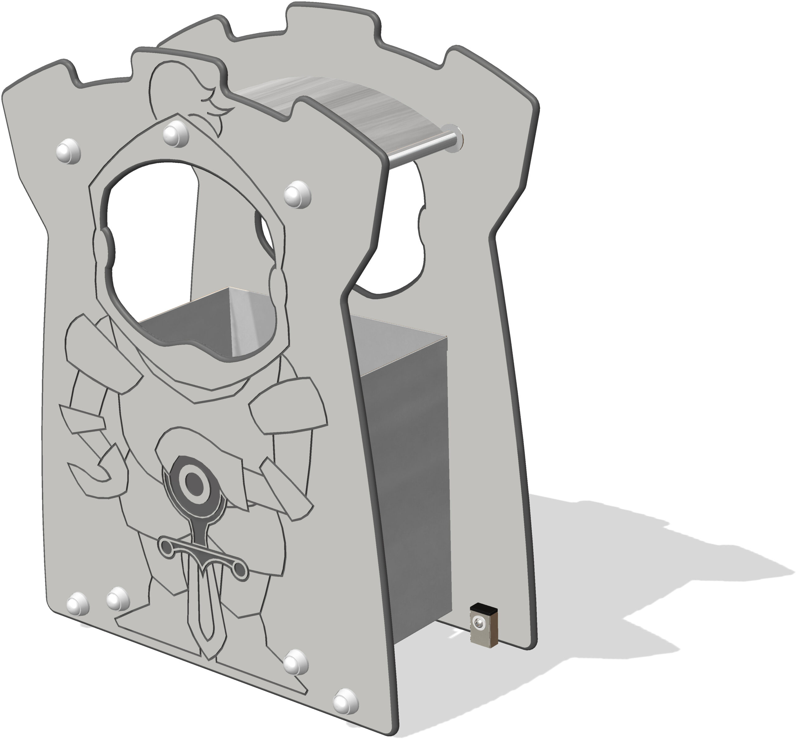Héraut de la propreté et défenseur du royaume des aires de jeux, voici un collecteur de déchets pas comme les autres ! Sa silhouette est celle d’une petite forteresse médiévale, dont le rempart principal est orné de l’effigie d’un valeureux chevalier en armure, prêt à veiller sur son domaine. La grande ouverture stylisée en forme de visière de casque invite les jeunes aventuriers à glisser leurs déchets, transformant un geste simple en un acte héroïque de sauvegarde du royaume. Sa structure robuste et ses créneaux supérieurs lui confèrent une allure à la fois imposante et fantaisiste. Ce n’est pas qu’une simple poubelle, c’est un personnage à part entière qui encourage les enfants à devenir les protecteurs de leur environnement, en déposant leurs papiers et emballages dans le « coffre au trésor » du chevalier. Un véritable allié pour maintenir l’ordre et la propreté, tout en stimulant l’imagination.