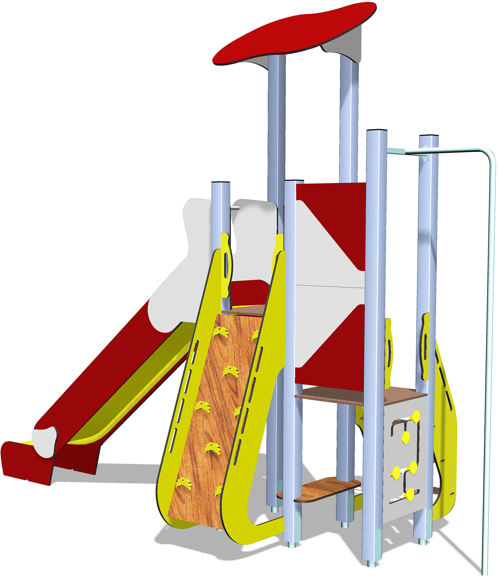 Préparez-vous pour une nouvelle exploration ! Pour atteindre la plateforme en hauteur, choisissez votre chemin : les marches d’escalier accessibles ou le mur d’escalade rempli de prises coco qui vous aideront à monter ! Une fois au sommet, sous le toit protecteur, préparez-vous à la grande descente : le toboggan vous attend pour une glissade pleine de sensations ! Et pour une pause ludique, un panneau d’activités sur le côté vous propose des jeux amusants avant de repartir à l’assaut. C’est l’endroit parfait pour bouger et s’amuser !
