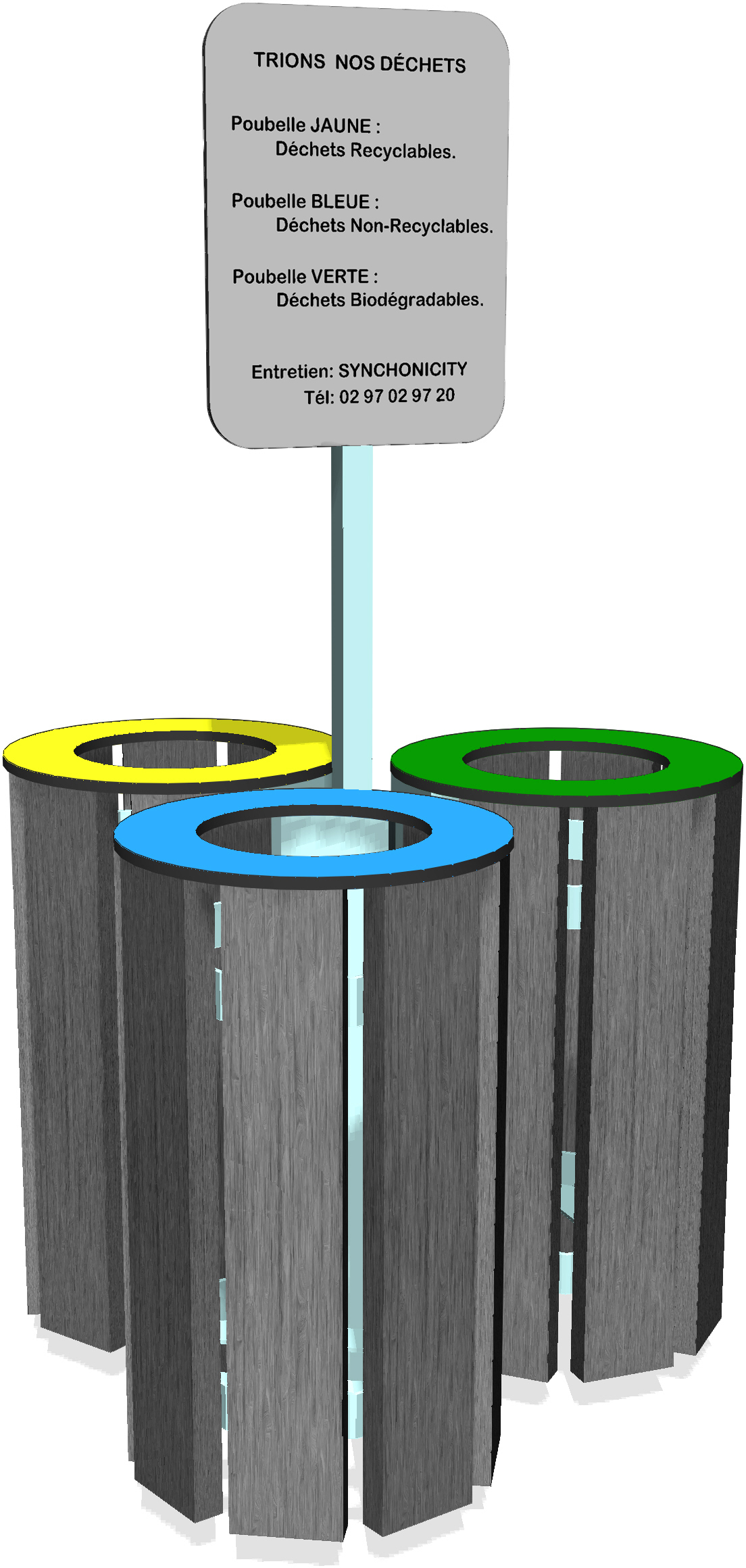 3 Poubelles + 1 panneau information. Voici la station de tri ultime, conçue pour transformer la gestion des déchets en un jeu d’équipe citoyen ! Cet ensemble se compose de trois réceptacles robustes et stylisés, chacun doté d’une ouverture supérieure distincte. Ces colonnes, revêtues de panneaux à l’aspect texturé et naturel, sont solidement regroupées autour d’un mât central. Ce mât soutient une plaque d’information claire (dont le contenu sera le seul à vous guider !) qui permet aux petits et grands de comprendre instantanément où déposer chaque type de déchet, les transformant en experts du recyclage. L’agencement en trèfle encourage l’accès facile et la participation de plusieurs personnes simultanément. Ce n’est pas seulement un outil, c’est un pôle éducatif qui enseigne de manière concrète l’importance du tri pour la planète, rendant le processus organisé, efficace et surtout, ludique.
