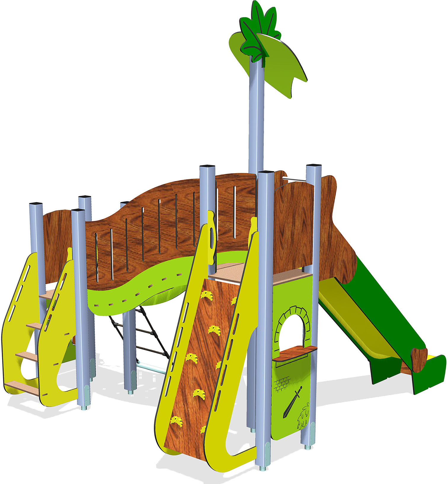 Une fois en haut, traversez le pont dénivelé sous la canopée de feuilles. C’est l’heure de la récompense : une descente ultra-rapide sur le grand toboggan !