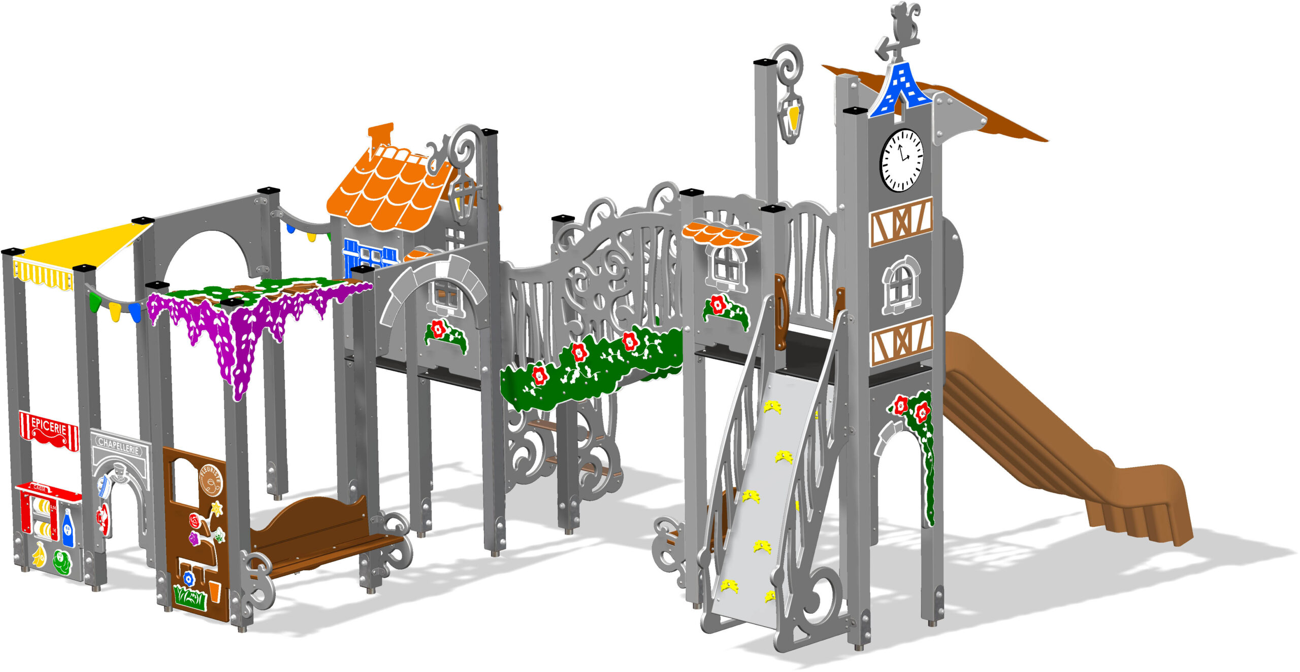 Oubliez les aires de jeux classiques et entrez dans un véritable petit bourg miniature où chaque recoin cache une nouvelle histoire ! Cette structure multi-activités aux allures de village pittoresque est le terrain de jeu idéal pour les petits aventuriers à l’imagination débordante.